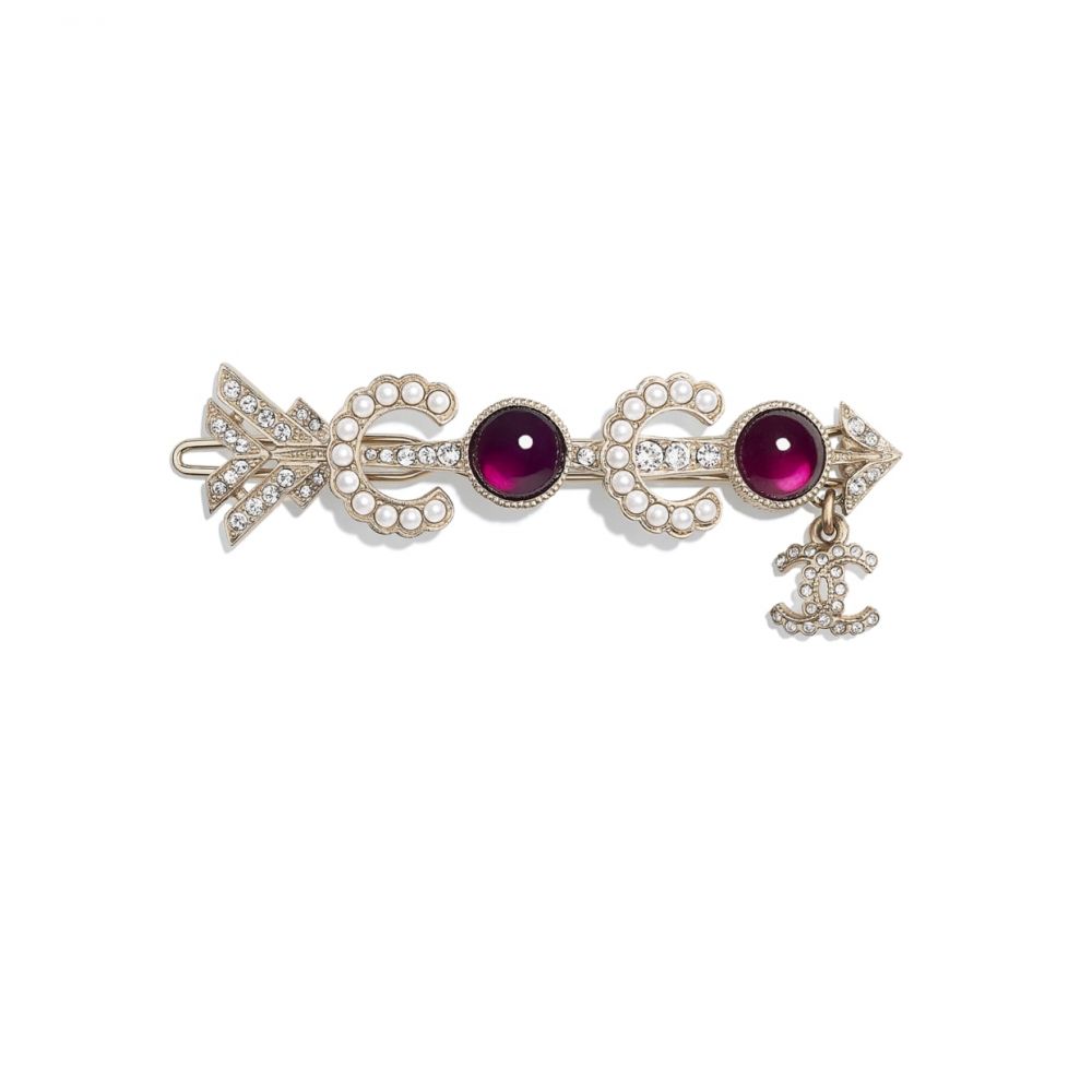 这款发夹从设计到风格都相当特别,透过采用仿珍珠、暗红水晶作为点缀,塑造出具有宫廷特色的「COCO」字样,精致又复古!另外再配合悬挂在别针上的CHANEL LOGO,令发夹更显高贵、甜美!