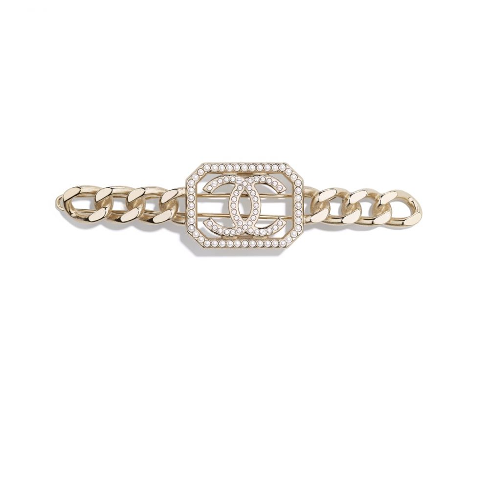 这款发夹的设计看上去相当简约,但同时亦拥有满满的精致感!发夹中间缀上了由仿珍珠及水晶构成的CHANEL logo,再配合旁边的金属链条纹设计,既可以令款式富有品牌的经典特色,亦加强了复古、温柔的感觉!
