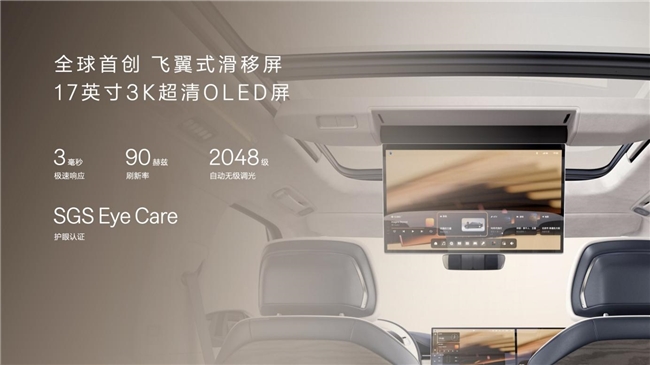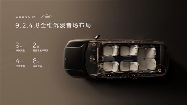 以五项NVH认证的静谧座舱为基石,极氪9X全车配备11块PVB隔音夹层玻璃,加入同级唯一的双主动降噪技术,车内语音清晰度在120公里时速下达到库里南92%的水准。与英国皇室御用音响品牌Naim深度合作,打造全球最大功率的车载音响,拥有3868瓦峰值功率,32个扬声器,支持杜比全景声。全球首创的17英寸3K飞翼式滑移屏,可在二三排间电动无级滑移88厘米,并支持5档角度调节。配合全新极氪AI OS 7智能座舱与双8295座舱芯片,提供更主动、更智能的交互体验。可开启天窗联动飞翼屏,实现车内直接放飞无人机,拍出绝美大片。