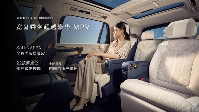 极氪9X整车座舱面积达6.3平米,人均超过1平米,6个成年人一同出行,不仅排排宽敞,还能装下8个20寸行李箱。第一排配备同级唯一主动侧翼支撑功能的黄金驾驶席,过弯时主动调节减少横向晃动,配合47英寸AR-HUD和专属越野APP,从容掌控任何路况。第二排两把行云座椅,拥有超越豪华MPV的宽大坐垫,可一键进入零重力模式,最大145度躺角,还能旋转180度与三排形成对坐模式,化身私人会客厅。第三排最大135度躺倒角度与140毫米电动滑移行程,加上专属独立天窗与“坐坐高升”布局,成为通透明亮的阳光房。全车六把座椅均采用超柔NAPPA全粒面头层真皮,透气亲肤,支撑充足。